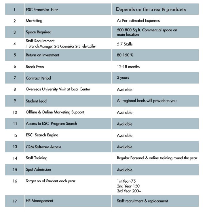 The company is backed by a sound Technical team in supporting and assisting the franchise for counseling, Visa, Admission and having centralized application and visa processing.